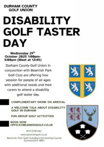 DCGU, in partnership with Beamish Park GC, will host a free Disability Golf Taster Session for individuals of all ages with additional needs on Wednesday, 29th October.